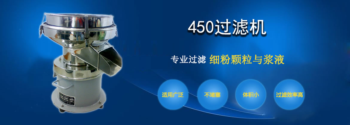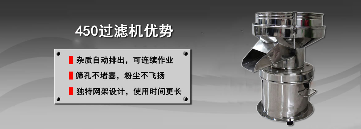 450过滤机是为适用于浆液过滤作业、粉粒分级而专门设计一种高效率、低噪音小型单层筛分机,它集液体过滤、粉粒分级功能为一体。在面粉、油漆过滤行业表现尤为卓越,如325目过滤比重1.1的喷漆料,每小时可达1200公升,30目筛分面粉每小时可处理700公斤。