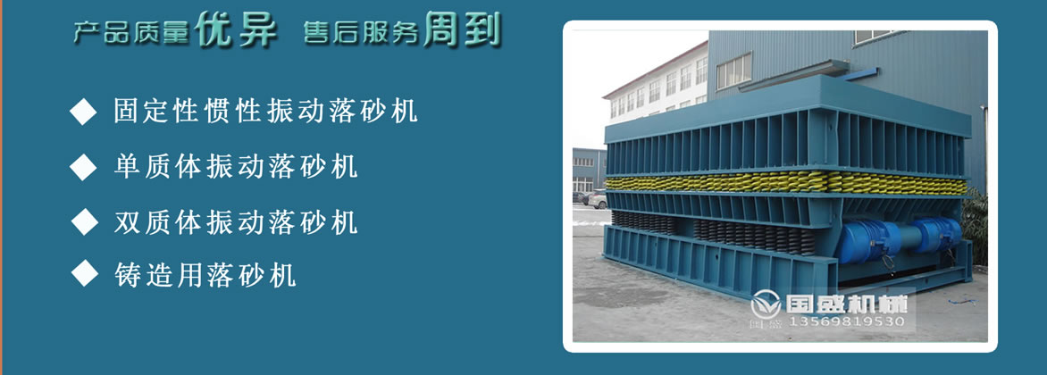 振动落砂机利用了振动激振的惯性力和弹性力的合成,安装的振动电机反向同步运行,水平分力保持相互平衡,垂直方向上的合力使得落砂机隔振体,以一定的加速度或工作质量相同的频率作正弦振动,带物料的模具被放在落砂栅床上,形成有效的振动冲击对铸件落砂破碎的,并且会与栅床之间留有一定的间隙,然后通过振动电机偏心块的旋转,带动栅床上下左右振动,同时就会不停的撞击模具底面,使模具上的物料充分与模具分离,以完成物料落砂过程。当空载时,设备的振动噪音低80dB,而负载时,振动幅度就会相对稳定,冲击噪音低,所以说是一种环保型的振动落砂机。